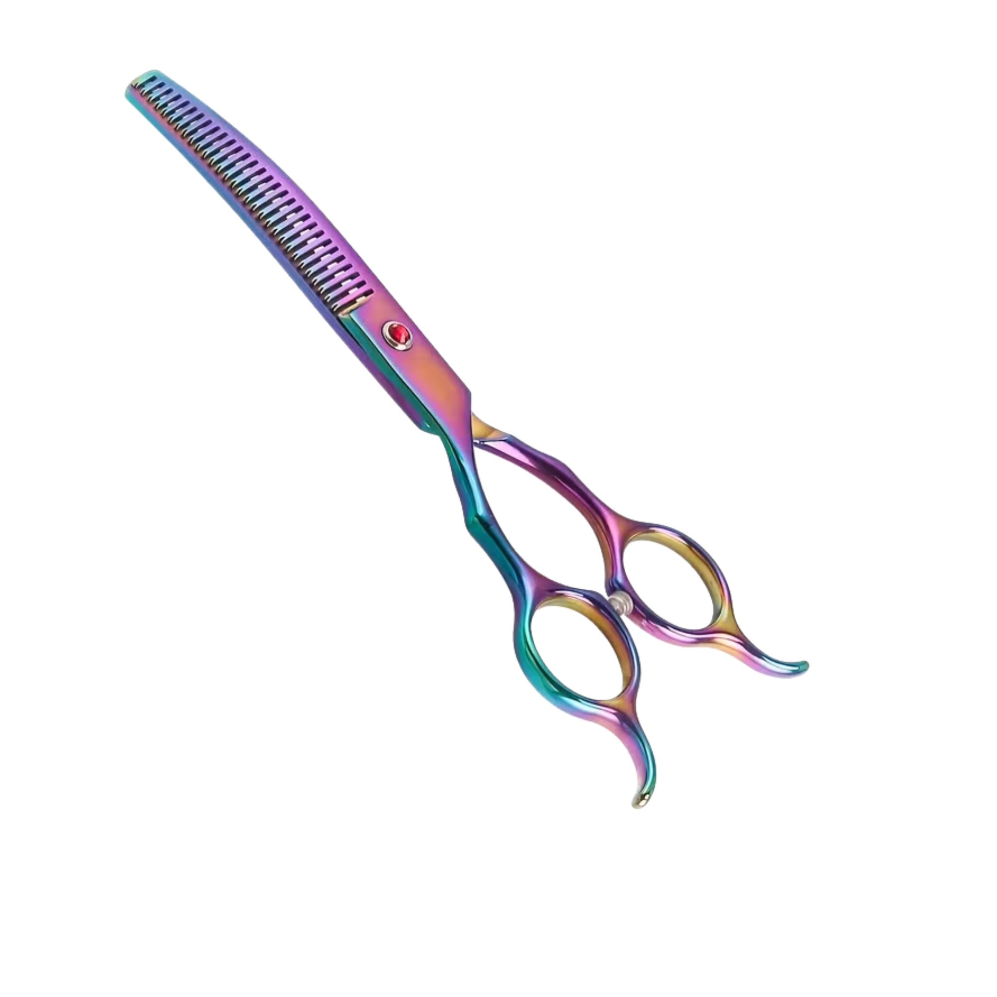 Vibrant Precision in Every Stroke. The Model 178 Iridescent Series combines a striking multi-color aesthetic with a specialized curved blade for ergonomic thinning and blending.