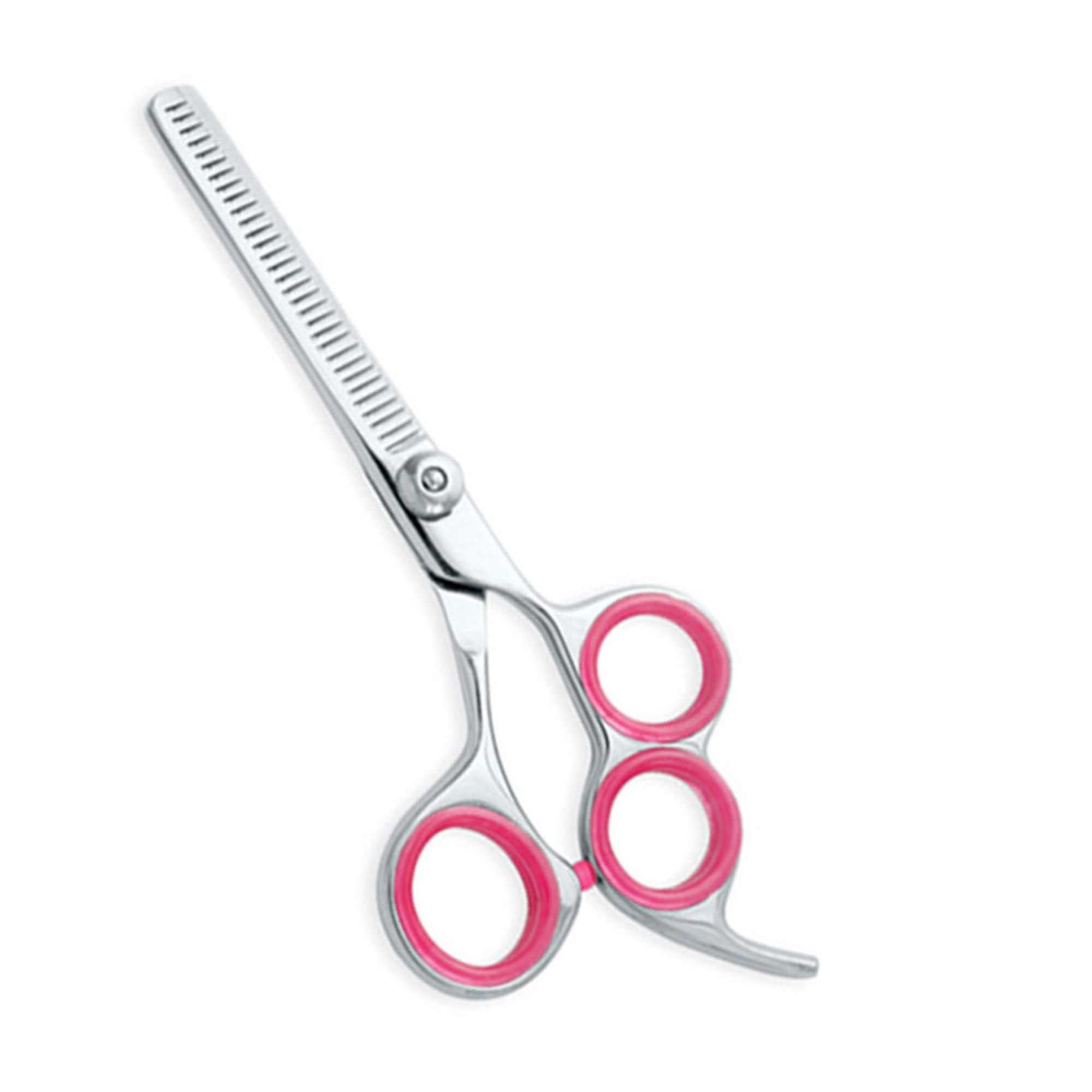 Enhance your blending precision with our Triple-Ring Ergonomic thinning shears. Features a 3-hole stability grip, pink comfort inserts, and a high-polish professional finish.